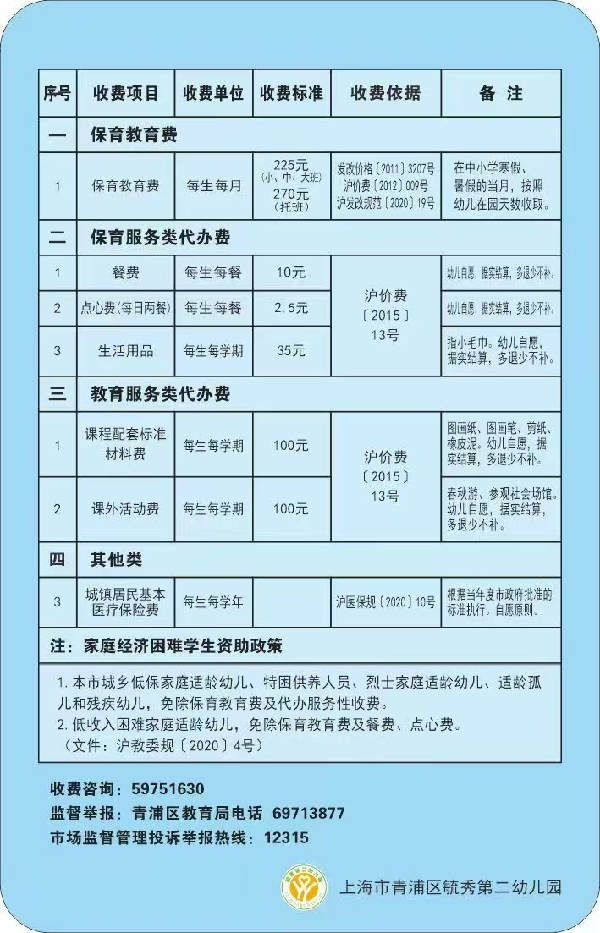 上海市青浦区毓秀第二幼儿园收费项目及标准公示